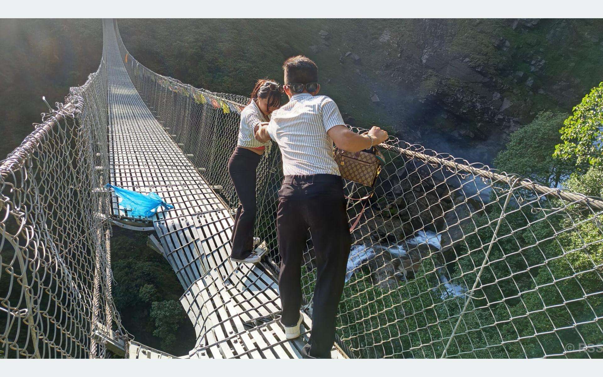 ओखलढुङ्गा,  यहाँ सेप्ली झरना जाने झोलुङ्गे पुलमा माथिबाट खसेको ढुङ्गाले क्षति पुर्‍याउँदा पर्यटक तथा सर्वसाधारणलाई आवागमनमा सास्ती भएको छ । तीन महिनाअघि माथिबाट खसेको ढुङ्गाले पुलको बीच भागमा क्षति पुर्‍याएको थियो । उक्त पुल मर्मत नहुँदा चाडपर्वका बेलामा झरना हेर्न आउने आन्तरिक तथा बाह्य पर्यटकका साथै सर्वसाधरणलाई आवतजावतमा समस्या भएको हो । दसैँ, दीपावलीलगायत पर्व मनाउन गाउँ फर्किएका अधिकांश मोलुङ गाउँपालिका-८ स्थित सुन्दर पर्यटकीयस्थल सेप्ली झरना घुम्न आउने गर्दछन् । अन्य समयमा छिटफुट मानिस आउने गरे पनि चाडपर्वको समयमा यहाँ आउने आन्तरिक पर्यटकको सङ्ख्या उल्लेख्य हुने स्थानीय बताउँछन् ।