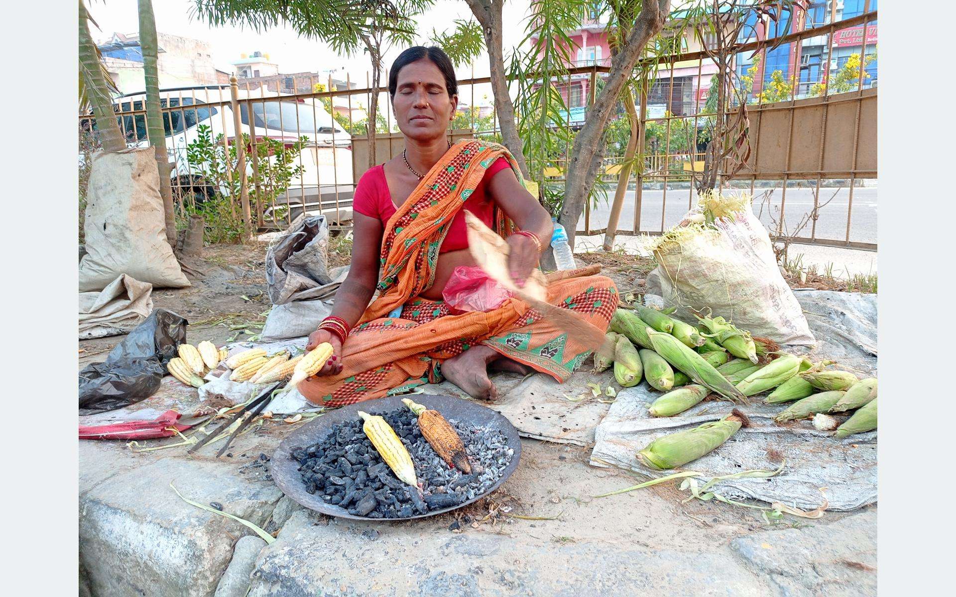 करिब ३०÷३५ किलोमिटर धाएर ल्याएको मकै सडकपेटीमै पसारेर हातमुख जोर्ने बन्दोबस्त गर्ने दासलाई त्यसरी आर्जेको एक गाँस खान पनि निकै हतार हुन्छ । “मकै लिन जाँदै एउटा थैलामा खानेकुरा बोकेर हिँड्छु, यहाँ बर्दिबासको सडकपेटीमा मकै बिसाउनासाथ ग्राहक झुम्मिन्छन्, आपूm खानेकुरा खानु कि ग्राहक हेर्नु हुन्छ”, दास भन्नुहुन्छ, “सधैँको राख्ने ठाउँबाट तावा र कोइला निकाल्छु, हतारहतार दुई गाँस खाएर मकै पोल्न थाल्छु ।”