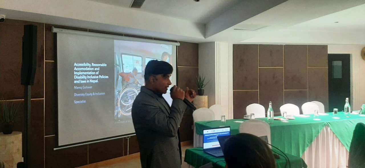 डाइभर्सिटी, इक्विटी एण्ड इन्क्लुजन स्पेसलिस्ट मनोज गोहीवारले अपाङ्गतासम्बन्धी राष्ट्रिय नीतिहरू, कानुनी संरचना, व्यावहारिक चुनौती, पहुँच विस्तारलगायत विषयमा प्रस्तुतीकरण दिँदै भौतिक संरचनामा सहज पहुँच, समावेशी नीति अवलम्बन गर्नु आजको आवश्यकता भएको धारणा राख्नुभयो । उहाँले नेपालको समावेशी नीति, पूर्वाधार तथा भौतिक संरचना, हाल लागू भएका नीति र कानुन, कानुनी पहुँचसम्बन्धी व्यवस्था, स्थानीय तहमा देखिने व्यावहारिक कठिनाइलगायत विषय सुधार गर्न समावेशी नीतिलाई प्रभावकारी कार्यान्वयन गर्नुपर्नेमा जोड दिनुभयो ।