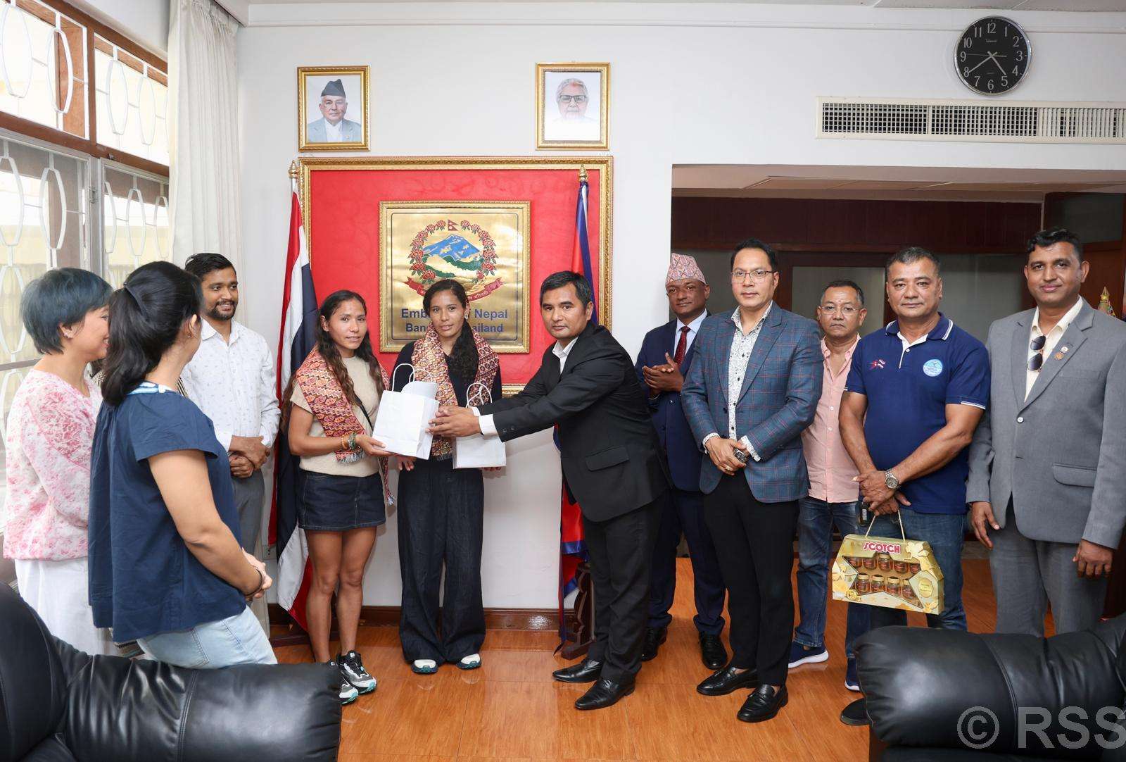 कार्यक्रममा नेपाली राजदूतावासका उपनियोग प्रमुख मोतीबहादुर श्रीसले धावकद्वयलाई बधाई दिँदै खादा लगाई मायाको चिनो प्रदान गरी सम्मान गर्नुभयो । उहाँले नेपाली खेलाडीको अन्तरराष्ट्रिय सफलताले नेपाललाई विश्वमा चिनाउन महत्त्वपूर्ण योगदान पुर्याउने उल्लेख गर्दै भविष्यमा पनि यस्ता प्रतिभालाई प्रोत्साहन गर्न राजदूतावास सधैँ साथमा रहने प्रतिबद्धता व्यक्त गर्नुभयो । उहाँले दूतावासले आयोजना गर्न लागेको लुम्बिनी नेपाल मिनी म्याराथुनका बारेमा समेत प्रकाश पार्नुभएको नेपाली दूतावास बैङ्ककले जनाएको छ ।