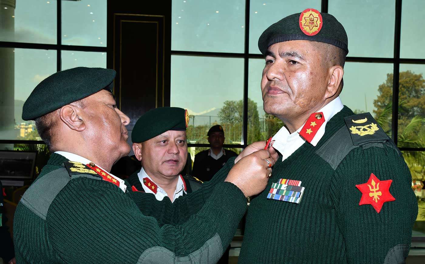 काठमाडौँ, प्रधानसेनापति अशोकराज सिग्देलले उपरथीमा पदोन्नति हुनुभएका प्रकाशराज थापालाई जङ्गी अड्डामा आज आयोजित एक कार्यक्रममा दर्ज्यानी चिह्न प्रदान गर्नुभएको छ ।सोही कार्यक्रममा उहाँले सहायक रथीमा बढुवा हुनुभएका दुई जनालाई पनि दर्ज्यानी चिह्न प्रदान गर्नुभएको जनसम्पर्क तथा सूचना निर्देशनालयले जनाएको छ ।राष्ट्रिय समाचार समिति(रासस)