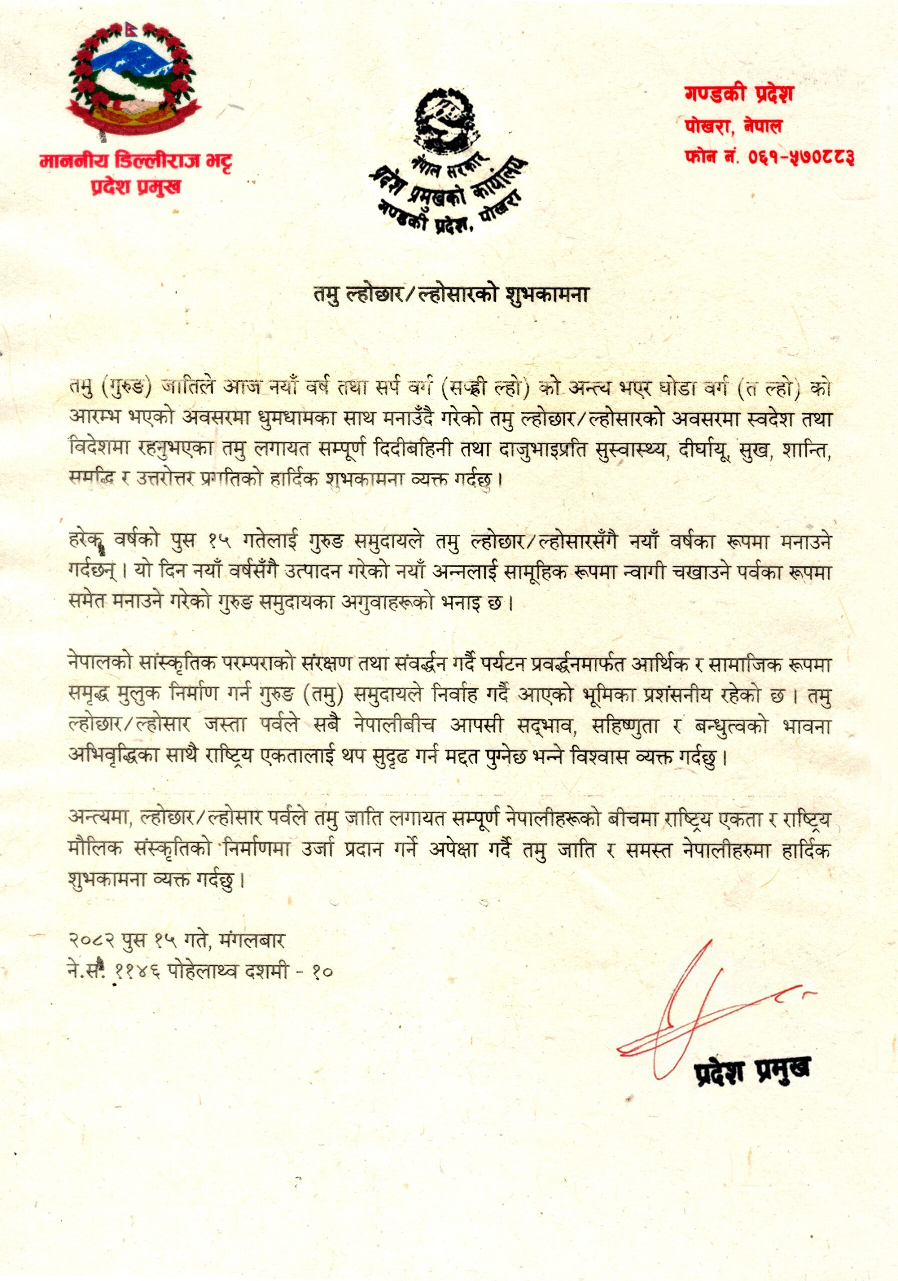 शुभकामना सन्देशमा उल्लेख छ – ‘तमु ल्होछार/ल्होसार जस्ता पर्वले सबै नेपालीबीच आपसी सद्भाव, सहिष्णुता र बन्धुत्वको भावना अभिवृद्धिका साथै राष्ट्रिय एकतालाई थप सुदृढ गर्न मद्दत पुग्नेछ भन्ने विश्वास व्यक्त गर्दछु ।’