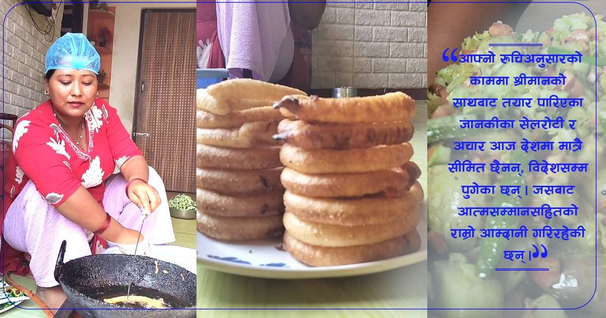यस्तै उदाहरण हुन् कैलालीको लम्कीचुहाकी जानकी रावत थापा । केही समयदेखि उनले आफ्नै घरको भान्साबाट सेलरोटी र अचार तयार पार्दै मनग्य आम्दानी गर्दै आएकी छन् । फेसबुक र टिकटकमा राखिएका भिडियो हेरेर सेलरोटी र अचारका पारखीहरूले उनलाई सम्पर्क गर्छन् । अनि ग्राहकको मागअनुसारको सेलरोटी र अचार जानकीले भनेकै स्थानमा पुर्याउछिन् ।