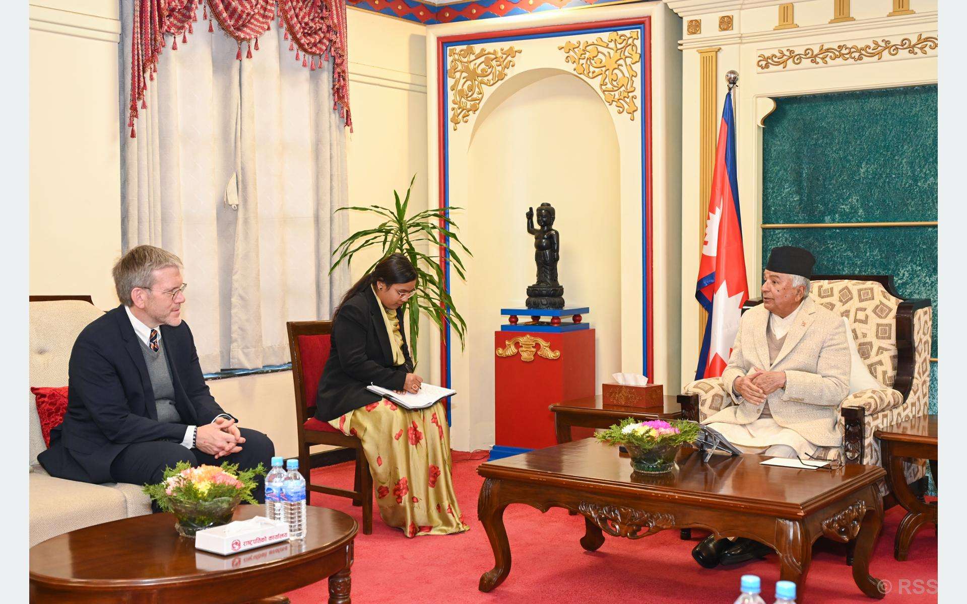 काठमाडौँ, राष्ट्रपति रामचन्द्र पौडेलसँग नेपालका लागि संयुक्त राज्य अमेरिकाका राजदूत डीन आर थम्सनले आज राष्ट्रपति भवनमा बिदाइ भेट गर्नुभएको छ ।त्यस अवसरमा उहाँहरूबीच नेपाल–अमेरिका सम्बन्धका साथै आपसी हित र चासोका विषयमा छलफल भएको राष्ट्रपतिको कार्यालयले जनाएको छ ।राष्ट्रिय समाचार समिति (रासस)