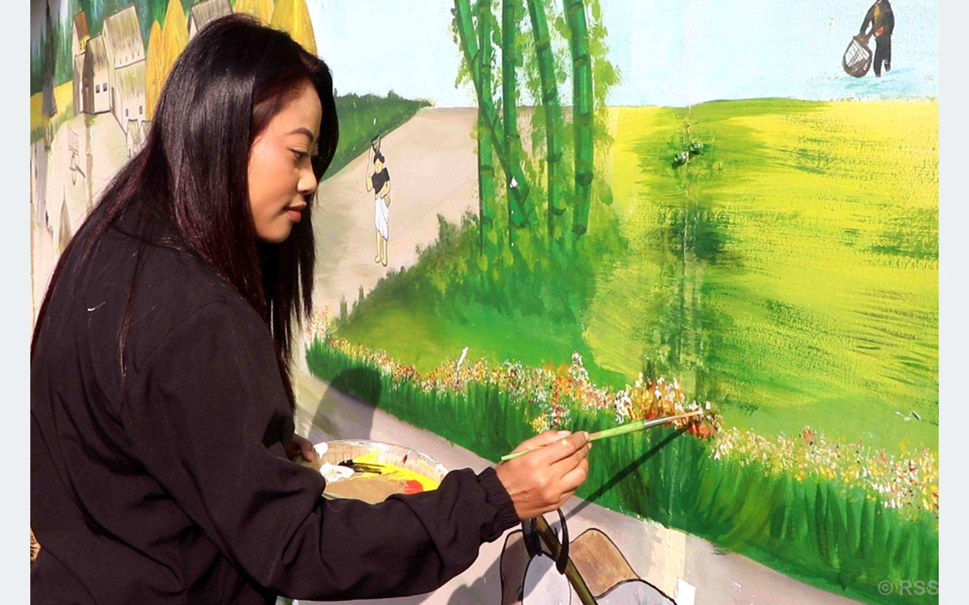 नारायणगढ (चितवन), खैरहनीको खिचरा महोत्सवस्थलमा पुग्दा एउटा पर्खालले धेरै दर्शकलाई केहीबेर रोक्छ । रङरेखाले सजिएको त्यो पर्खाल कुनै साधारण ‘वाल’ पेन्टिङ होइन, त्यो थारु समुदायको इतिहास, संस्कृति र जीवनशैली बोलिरहेको क्यानभास हो । चितवनको राप्ती नगरपालिका–६ बेल्डियाकी कलाकार सोमिना चौधरीले त्यो क्यानभासमा वास्तविकता भर्नुभएको हो ।