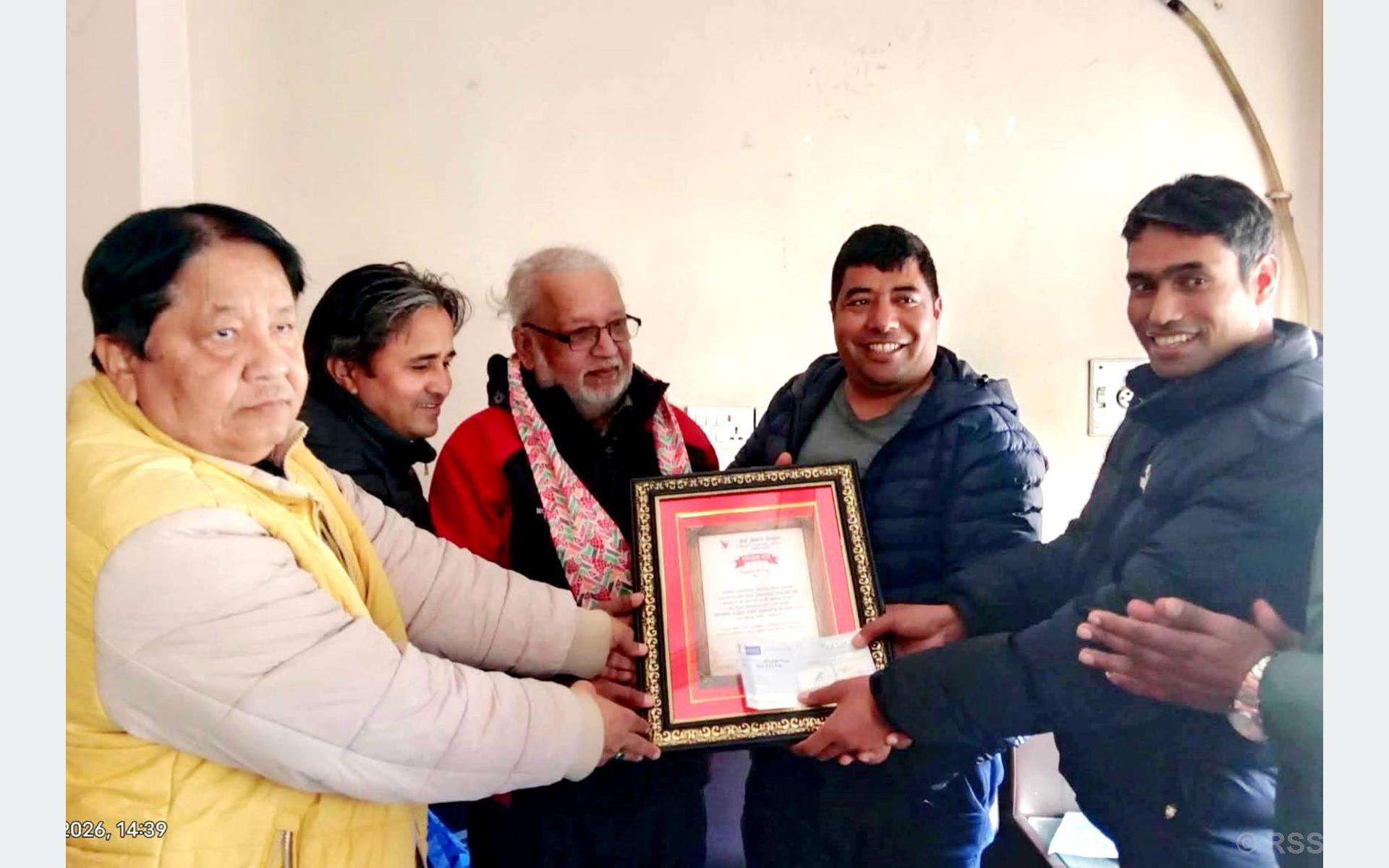 वरिष्ठ पत्रकार पिटरलाई प्रेस सेन्टर नेपालका केन्द्रीय सचिव मानबहादुर विक, केन्द्रीय सदस्य सिराज खान र पूर्वकेन्द्रीय सदस्य डा डक्टप्रसाद धितालले संयुक्त रूपमा रु ३० हजार राशिको पुरस्कार हस्तान्तरण गर्नुभयो ।