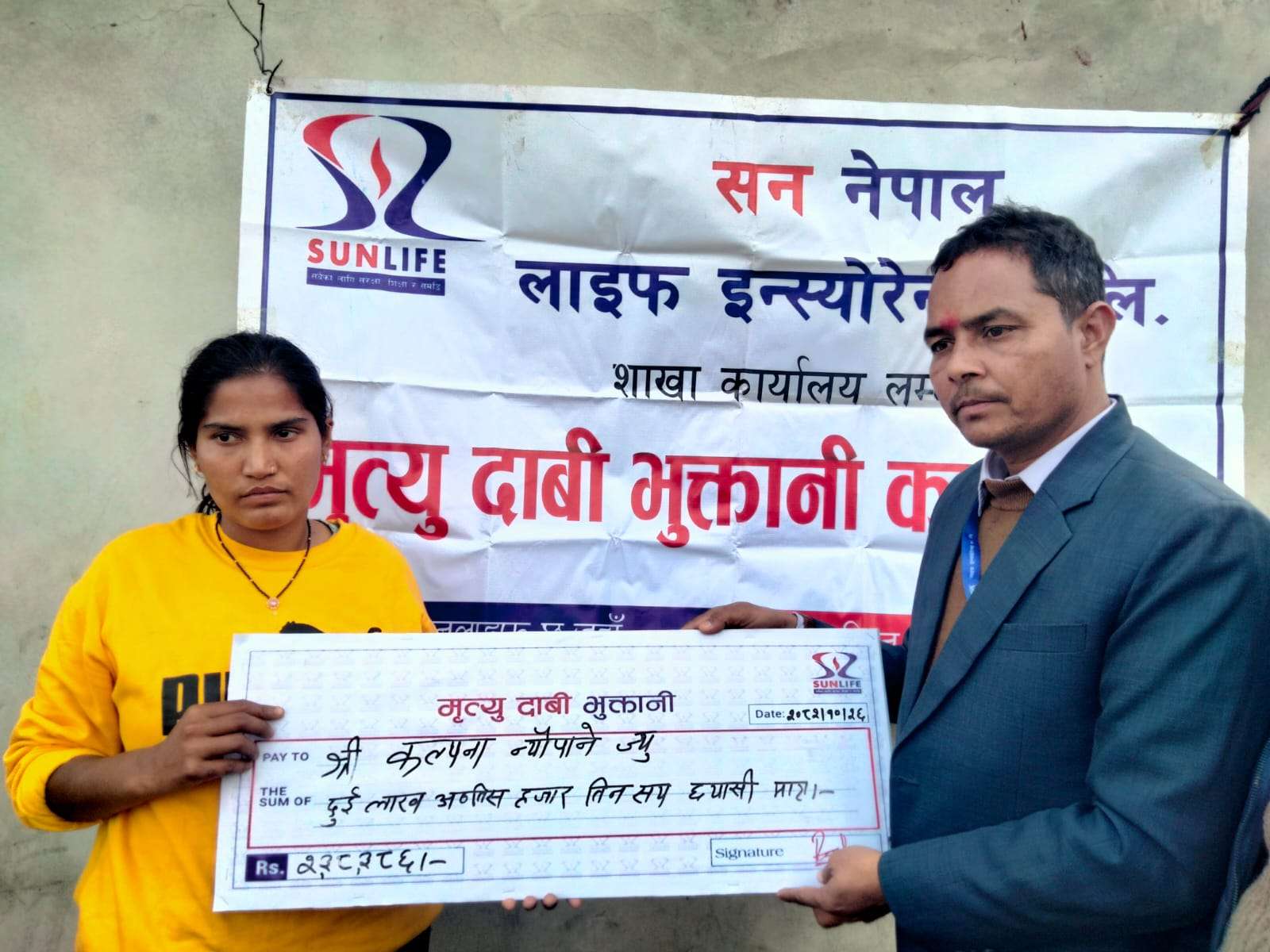 ब्लड क्यान्सरका कारण निधन भएका बीमित न्यौपानेको मृत्यु पश्चात उनका हकवाला पत्नी कल्पना न्यौपानेलाई कम्पनीले एक औपचारिक कार्यक्रममार्फत २ लाख ३८ हजार ३ सय ८६ रुपैयाँ बराबरको चेक हस्तान्तरण गरेको हो। स्वर्गीय न्यौपानेले सन नेपाल लाइफ इन्स्योरेन्समा २ लाख १ हजार रुपैयाँ बीमाङ्कको जीवन बीमा गराएका थिए।