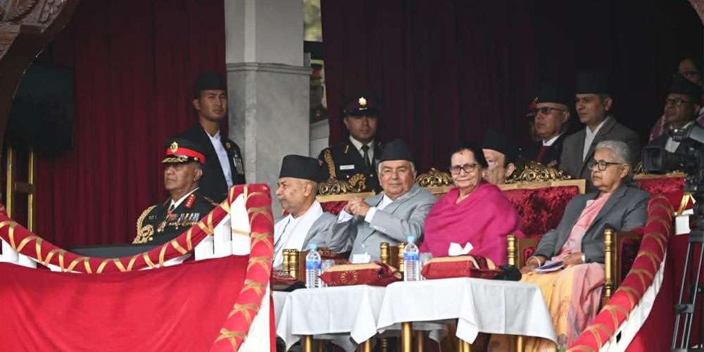 काठमाडौँ, राष्ट्रपति रामचन्द्र पौडेल महाशिवरात्रि तथा २६३औँ सेना दिवसका अवसरमा नेपाली सेनाद्वारा सैनिक मञ्च टुँडिखेलमा आज आयोजित विशेष समारोहमा सरिक हुनुभयो । सो अवसरमा उहाँले त्यहाँस्थित सैनिक स्मारकमा पुष्पहार अर्पण गरी श्रद्धाञ्जली व्यक्त गर्नुका साथै नेपाली सेनाद्वारा अर्पण गरिएको सलामी ग्रहण गर्नुभयो ।