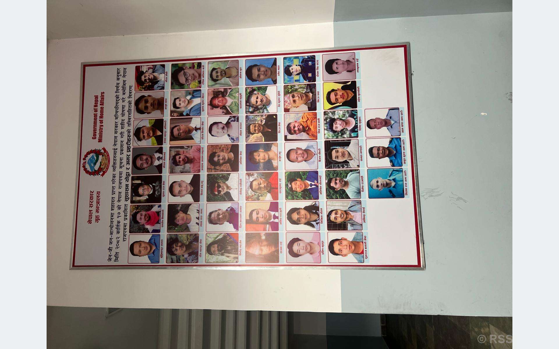 काठमाडौँ, गृह मन्त्रालय प्रवेश गर्दै गर्दा सिँढी नजिकैको भित्तामा ‘फ्लेक्स ब्यानर’मा केही तस्बिरहरू झुन्डिएका छन् । ढोकाबाट भित्र पस्ने जो–कोहीको नजर सिधै तिनै भित्तामा ठाकिन्छन् । ती तस्बिरमा ४५ अनुहारहरू छन् । निर्जीव तस्बिर भए पनि तिनका आँखामा हेर्दा अधुरा सपना र परिवर्तनको आह्वान गरिरहेको आभाष हुन्छ ।