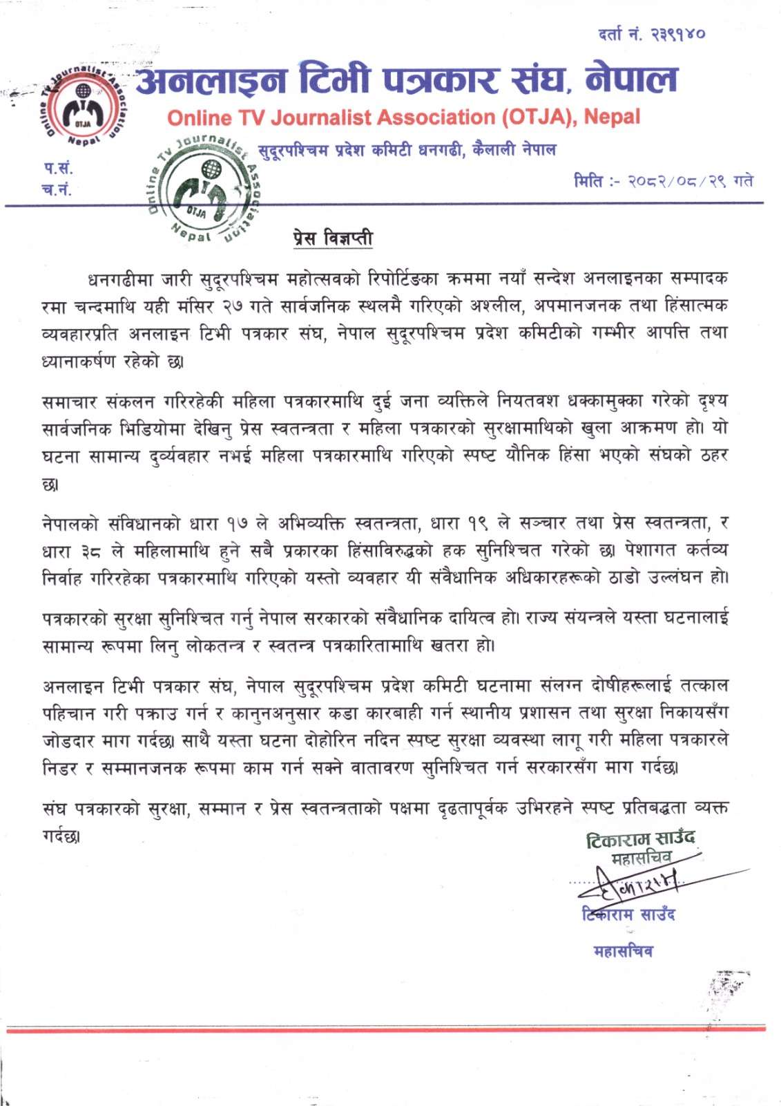 धनगढी– धनगढीमा जारी सुदूरपश्चिम महोत्सवको रिपोर्टिङका क्रममा नयाँ सन्देश अनलाइनका सम्पादक रमा चन्दमाथि मंसिर २७ गते सार्वजनिक स्थलमै गरिएको अश्लील, अपमानजनक तथा हिंसात्मक व्यवहारप्रति अनलाइन टिभी पत्रकार संघ, नेपाल सुदूरपश्चिम प्रदेश कमिटीले गम्भीर आपत्ति जनाएको छ।