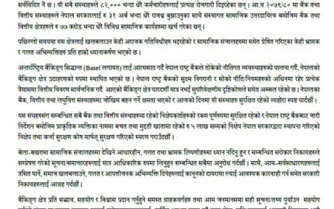 पुरा पढ्नुहोसकाठमाडौ। बैंक तथा वित्तीय संस्थाहरुले बैकिङ क्षेत्रलाई खलबलाउन केही अराजक गतिविधिहरु भइरहेको र सामाजिक संजालमा समेत प्रेषित गरिएका केही भ्रामक र गलत अभिव्यक्तिहरुप्रति आफ्नो ध्यानाकर्षण भएको जनाएका छन् । पछिल्लो समयमा बैंकिङ क्षेत्रमा धेरै नकारात्मक