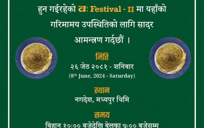 पुरा पढ्नुहोसभक्तपुर । भक्तपुरको मध्यपुर थिमिमा वः महोत्सव हुने भएको छ । वः मास, मुगी तथा अन्य विभिन्न गेडागुडी भिजाइ सफा गरी पिसेर आफूलाई मनपर्ने अण्डा, माछा, मासु तथा मरमसला मिलाइ टावामा विभिन्न आकारप्रकार दिइ