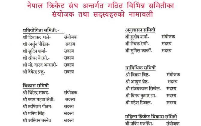 पुरा पढ्नुहोसकाठमाडौँ । नेपाल क्रिकेट संघ (क्यान) ले विभिन्न समिति गठन गरेको छ । क्यानले दुई बर्ष कार्यकाल रहेका पाँच समिति गठन गरेको हो ।क्यानले दिवाकर घलेको संयोजकत्वमा प्रतियोगिता समिति, सुदीप शर्माको संयोजकत्वमा अनुशासन समिति,