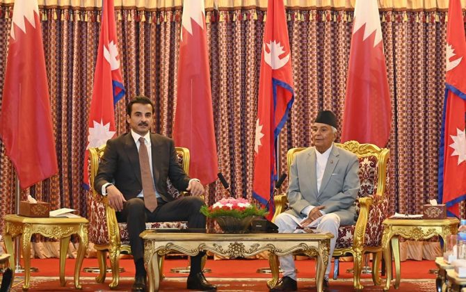 काठमाडौँ । कतारका अमिर शेख तमिम बिन हमाद अल थानी दुईदिने भ्रमणका क्रममा काठमाडौँ आइपुगेका छन् । थानी चढेको विमान ३ :४२ मिनेटमा त्रिभुवन अन्तर्राष्ट्रिय विमानस्थलमा अवतरण भएको छ । अमिर थानीलाई स्वागत राष्ट्रपति रामचन्द्र