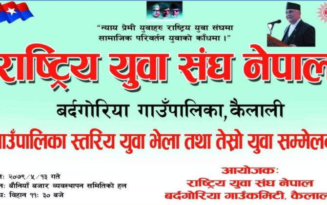 पुरा पढ्नुहोसकैलाली“न्याय प्रेमि युवाहरु राष्ट्रिय युवा संघमा सामाजिक परिवर्तन युवाको काधमा ” भन्ने मुल मर्म बाेकेकाे राष्ट्रिय युवा संघ नेपाल बर्दगाेरियाकाे तेस्रो सम्मेलन सम्पन्न भएको छ । देशकै सबैभन्दा ठुलो युवाहरुकाे संगठनकाे रुपमा परिचित रहेको