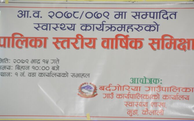 पुरा पढ्नुहोसबौनियाँ,कैलाली –कैलालीको बर्दगोरिया गाउँपालिका गाउँ कार्यपालिकाको कार्यालय स्वास्थ्य शाखा मुढा कैलाली द्वारा आर्थिक बर्ष २०७८/०७९ मा सम्पादित स्वास्थ्य कार्यक्रम अन्तर्गत आज वडा नं १ को सभा हलमा सम्पन्न भएको छ ।कार्यक्रममा बर्दगोरिया गाउँपालिका वडा