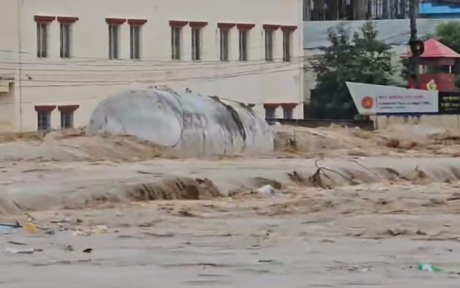 बाढीले बगाएको ग्याँस बुलेट एमालेको केन्द्रीय कार्यालय नजिक अड्कियो