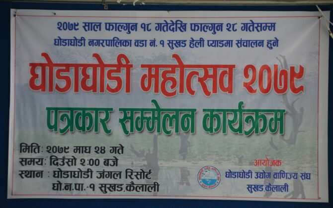 पुरा पढ्नुहोसकैलाली । विश्व रामसार सूचीमा सूचीकृत पर्यटकीय क्षेत्र घोडाघोडीको प्रचारप्रसार र स्थानीय कला सास्कृतिकको संरक्षण गर्ने उद्देश्यले कैलालीको घोडाघोडी नगरपालिका-१ सुखडको हेलि प्याडमा घोडाघोडी महोत्सव हुने भएको छ । “कला संस्कृतिक कृषि, पर्यटन र