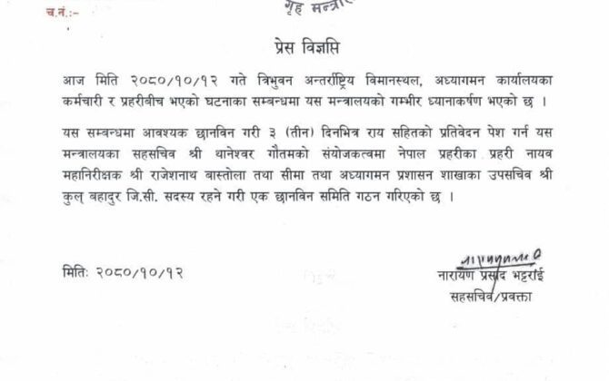 काठमाडौं । त्रिभुवन अन्तराष्ट्रिय विमानस्थल, अध्यागमन कार्यालयमा अध्यागमनका कर्मचारीलाई प्रहरीले कुटेको बारेमा छानबिन गर्न गृह मन्त्रालयले छानबिन समिति गठन गरेको छ।घटनाको आवश्यक छानबिन गरी तीन दिनभित्र प्रतिवेदन पेश गर्न तीन सदस्यीय छानबिन समिति गठन