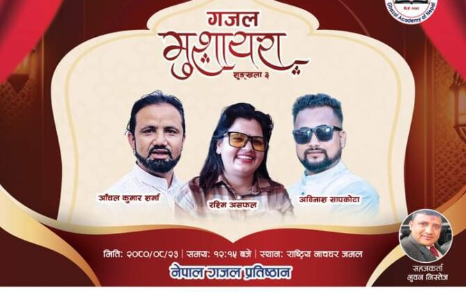 पुरा पढ्नुहोसकाठमाडौं । नेपाल गजल प्रतिष्ठानले हरेक २ महिनामा आयोजना गर्दै आएको ‘गजल मुशायरा’ मा यस पटक ३ जना गजल स्रष्टा प्रस्तुत हुँदैछन् ।मङ्सिर २३ गते शनिबार राष्ट्रिय नाचघर जमलमा गजलकारहरू रश्मि असफल, आँचलकुमार शर्मा