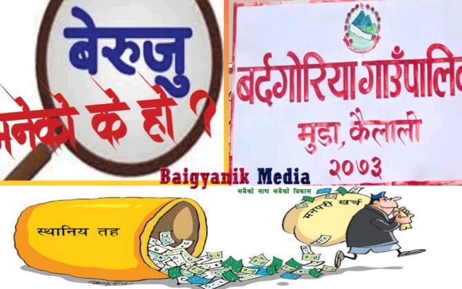 पुरा पढ्नुहोसबौनियाँ ,कैलाली। बुधबार सार्वजनिक भएको महालेखा परीक्षकको तथ्यांकअनुसार कैलालीको बर्दगोरिया गाउँपालिकामा २ करोड ५५ लाख ४५ हजार बेरुजु आएको छ । महालेखा परिक्षणले आज बुधबार ५९ औँ लेखा परीक्षण प्रतिवेदन सार्वजनिक गरेको तथ्यांकअनुसार आर्थिक वर्ष