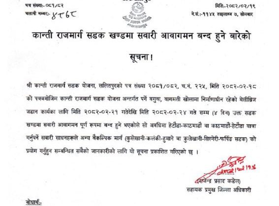 बेलीब्रिज जडान गर्न ४ दिनसम्म कान्ति लोकपथ बन्द हुने