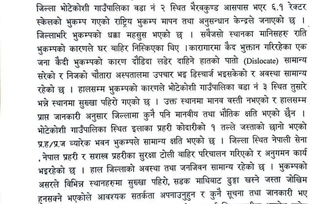 पुरा पढ्नुहोसजिप्रका सिन्धुपाल्चोकले भन्यो– ६.१ रेक्टरको भूकम्पबाट त्यस्तो कुनै क्षति भएको छैन