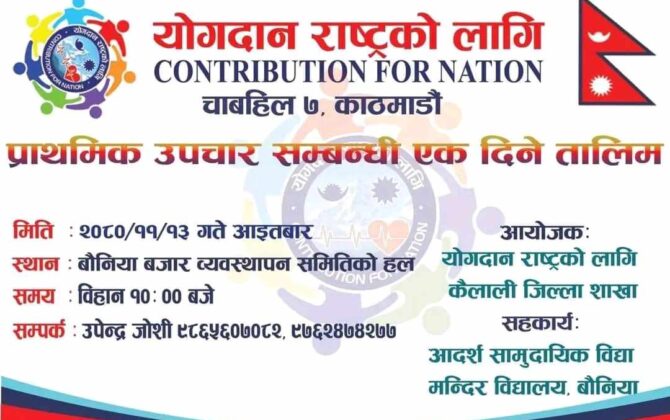 पुरा पढ्नुहोसकैलाली । योगदान रास्ट्रको लागिले आज कैलालीमा प्राथमिक उपचार सम्बन्धि एक दिने तालिम सम्पन्न गरेको छ। योगदान रास्ट्रको लागि कैलाली जिल्ला शाखा द्रारा संचालन आर्दश सामुदायिक बिद्या मन्दिरको सहकार्यमा सुरु भएको प्राथमिक उपचार सम्बन्धि
