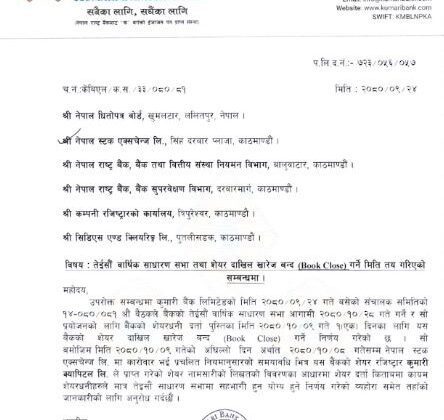 काठमाडौ। कुमारी बैंकले साधारण सभा बोलाएको छ । सभा २८ माघमा बस्ने भएको छ ।बैंक सञ्चालक समितिको मंगलबार बसेको बैंठकले सो दिन सभा गर्ने निर्णय गरेको हो । बैंकले यो वर्ष लाभांश सभामा लाभांश