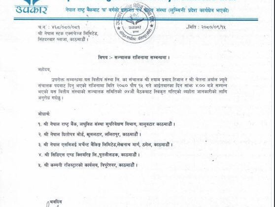 पुरा पढ्नुहोसकाठमाडौं । उपकार लघुवित्त वित्तीय संस्थाका दुई सञ्चालकको राजीनामा स्वीकृत भएको छ। कम्पनीका सञ्चालक श्यामप्रसाद रिजाल र चेतना अर्यालले आफ्नो पदबाट दिएका थिए। उनीहरूले बुझाएको राजीनामा कम्पनीको पुस १५ गते बसेको सञ्चालक समितिको बैठकले स्वीकृत