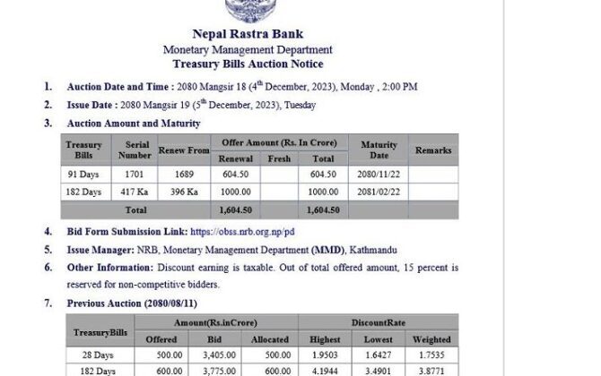 राष्ट्र बैंकले १६ अर्ब ४० करोडको ट्रेजरी बिल बिक्री गर्ने