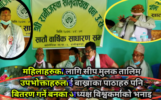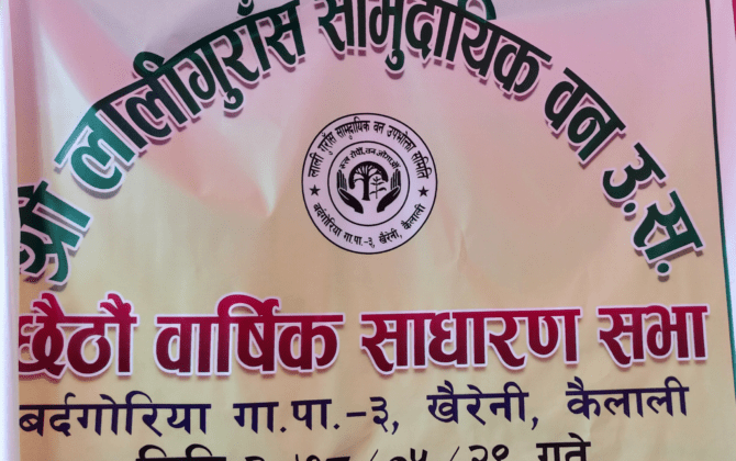पुरा पढ्नुहोसबौनियाँ कैलाली । कैलालीको बर्दगोरिया वडा नम्बर ३ स्थित श्री लालीगराँस सामुदायिक वन उपभोक्ता समुहको छैटौं बार्षिक साधारण सभा सम्पन्न भएको छ ।मंगलबार सामुदायिक वन उपभोक्ता समुहका अध्यक्ष भीम वहादुर कुवँरको सभापतित्वमा भएको कार्यक्रमका