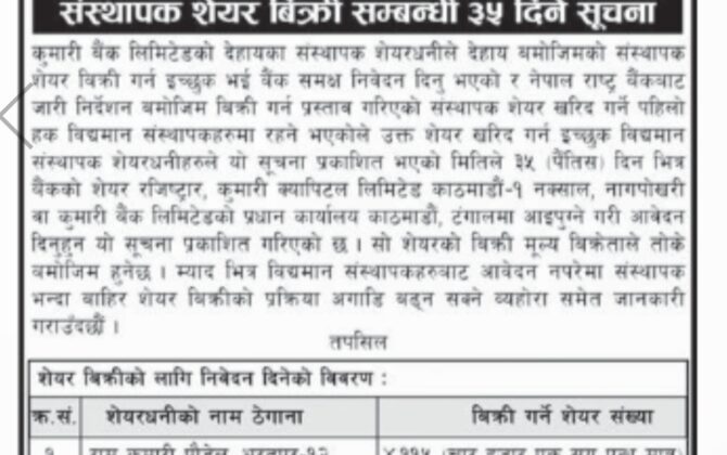 पुरा पढ्नुहोसकाठमाडौ । कुमारी बैंकले ४ हजार ११५ कित्ता संस्थापक सेयर बिक्रीमा ल्याएको छ । बैंकले आफ्ना १ जना संस्थापक सेयरधनी रामकुमारी पौडेलको नाममा रहेको सेयर बिक्री खुला गरेको हो । उक्त सेयरमा बैंकका विद्यमान अन्य