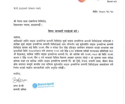 पुरा पढ्नुहोसकाठमाडौ। सूर्यज्योति लाइफ इन्स्योरेन्सले साविकको ज्योति लाइफ इन्स्योरेन्सको नाफा रिजर्भ कोषमा राख्ने निर्णय गरेको छ । सूर्यज्योति लाइफ इन्स्योरेन्सको बिहीबार बसेको सञ्ञचालक समितिको बैठकले उक्त नाफा नाफा रिजर्भ कोषमा राख्ने निर्णय गरेको हो ।साविकको ज्योति
