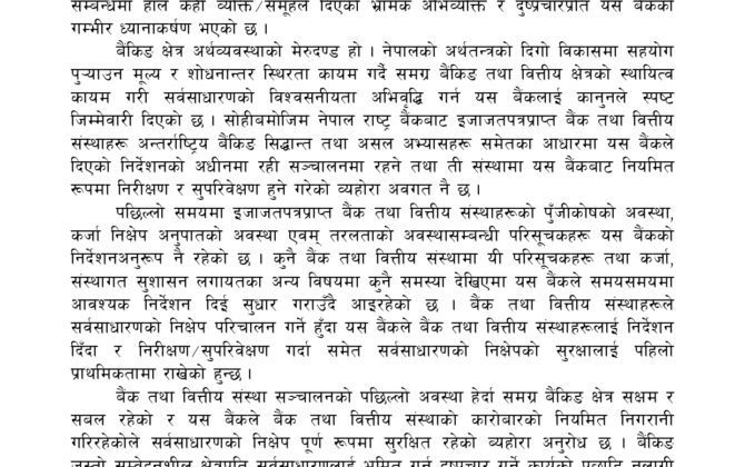 पुरा पढ्नुहोसकाठमाडौं । नेपाल राष्ट्र बैंकले बैंक तथा वित्तीय संस्थाहरूको सञ्चालन तथा स्थायित्वका सम्बन्धमा केही व्यक्ति र समूहले भ्रामक अभिव्यक्ति र दुष्प्रचार गरेको भन्दै आफ्नो गम्भीर ध्यानाकर्षण भएको जनाएको छ । मंगलबार विज्ञप्ति जारी गरेर राष्ट्र