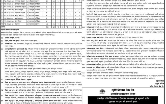 काठमाडौ। कृषि विकास बैंकले कर्मचारी माग गरेको छ । शुक्रबार सार्वजनिक सूचना निकालेर बैंकले स्थायी दरबन्दीका लागि ११२ कर्मचारी माग गरेको हो ।बैंकले २ जना शाखा प्रमुख, २ जना वरिष्ठ लेखा अधिकृत, ३२ जना व्यवसाय