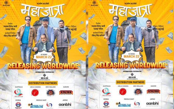 पुरा पढ्नुहोसकाठमाडौँ । नेपाली फिल्म ‘महाजात्रा’ नेपालसहित विश्वभर एकसाथ प्रदर्शन हुने भएको छ । षट्कोण आर्टसले निर्माण गरेको ‘जात्रा’ शृङ्खलाको तेस्रो भाग ‘महाजात्रा’ नेपाल र भारत बाहेकको प्रदर्शन र वितरणको अधिकार खरिद गरेको एमएसएम इन्टरटेन्मेन्टस्ले