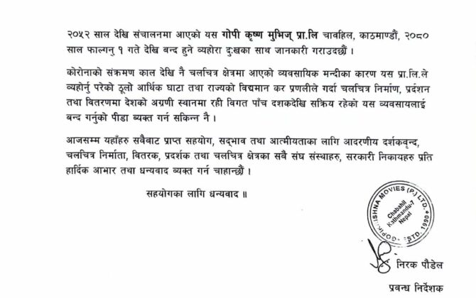 काठमाडौं। गोपीकृष्ण सिनेमा हल आगामी १ फागुनेदेखि बन्द हुने भएको छ ।गोपीकृष्ण सिनेमा हल आगामी १ फागुनेदेखि बन्द हुनेबारे शुक्रबार गोपीकृष्ण मुभिज प्रालिले विज्ञप्ति जारी गरेर जानकारी दिएको हो । कोरोनाकालदेखि चलचित्र क्षेत्रमा आएको व्यावसायिक