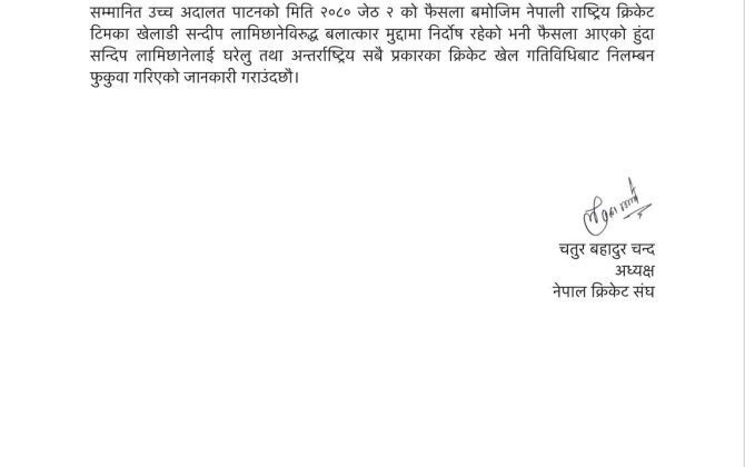 पुरा पढ्नुहोसकाठमाडौँ । नेपाल क्रिकेट संघ (क्यान) ले सन्दीप लामिछानेमाथिको निलम्बन फुकुवा गरेको छ ।क्यानले पाटन उच्च अदालतको फैसला बमोजिम सन्दीपमाथिको निलम्बन फुकुवा गरेको अध्यक्ष चतुर बहादुर चन्दले जानकारी दिएका हुन् ।पाटन उच्च अदालतले आजै सन्दीपलाई
