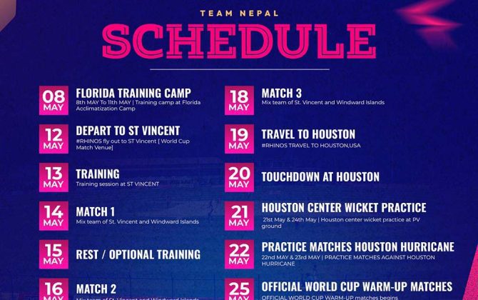 काठमाडौँ । टी-२० विश्वकप खेल्न अमेरिका पुगेको नेपाली राष्ट्रिय क्रिकेट टीमको प्रशिक्षणको तालिका सार्बजनिक गरिएको छ ।नेपाल क्रिकेट संघ (क्यान) ले अमेरिकामा हुने नेपाली टिमको प्रशिक्षणको तालिका सार्बजनिक गरेको हो ।जस अनुसार नेपाली टिमले