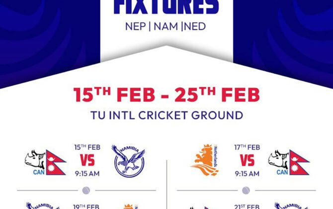 पुरा पढ्नुहोसकाठमाडौँ । नेपाल क्रिकेट संघ (क्यान) ले आइसीसी पुरुष क्रिकेट विश्वकप लिग-२ अन्तर्गतको त्रिकोणीय सिरिजको खेल तालिका सार्बजनिक गरेको छ ।नेपालसहित नामिबिया र नेदरल्याण्डससहितको क्रिकेट विश्वकप कप लिग-२ अन्तर्गतको यो सिरिज फेब्रुअरी १५ अर्थात