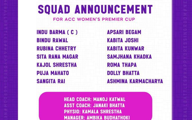 पुरा पढ्नुहोसकाठमाडौँ। नेपाल क्रिकेट संघ (क्यान) ले फेब्रुअरी १० देखि १८ सम्म मलेसियामा हुने एसीसी महिला प्रिमियर कपमा सहभागी हुने टिमको छनौट गरेको छ ।क्यानले इन्दु बर्माको कप्तानीमा एसीसी महिला प्रिमियर कप खेल्ने १४ सदस्यीय