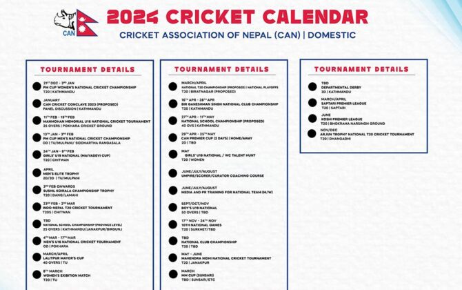 पुरा पढ्नुहोसकाठमाडौं । नेपाल क्रिकेट संघ (क्यान) ले सन् २०२४ को वार्षिक खेल तालिका सार्वजनिक गरेको छ । क्यानले बिहीबार वर्षभर आयोजना गरिने खेल तालिका सार्बजनिक गरेको हो ।क्यानद्वारा सार्वजनिक गरिएको वार्षिक क्यालेन्डरमा जनवरी ५