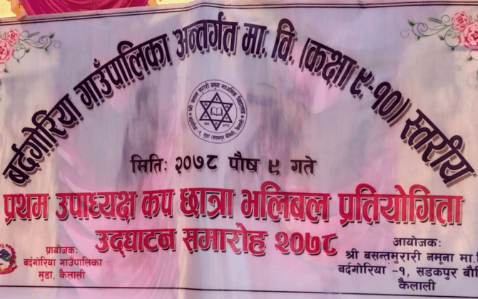 पुरा पढ्नुहोसबौनियाँ,कैलाली । कैलालीको बर्दगोरिया गाउँपालिकामा शुक्रबार देखि गाउँपालिका अंतरगत मावि कक्षा ९ -१० स्तरीय प्रथम उपाध्यक्ष कप छात्रा भलिबल प्रतियोगिता शुरु भएको थियो । बर्दगोरिया गाउँपालिकाको कार्यालयको प्रायोजनमा बसन्तमुरारी नमूना माध्यमिक विद्यालयको आयोजनामा प्रतियोगिता