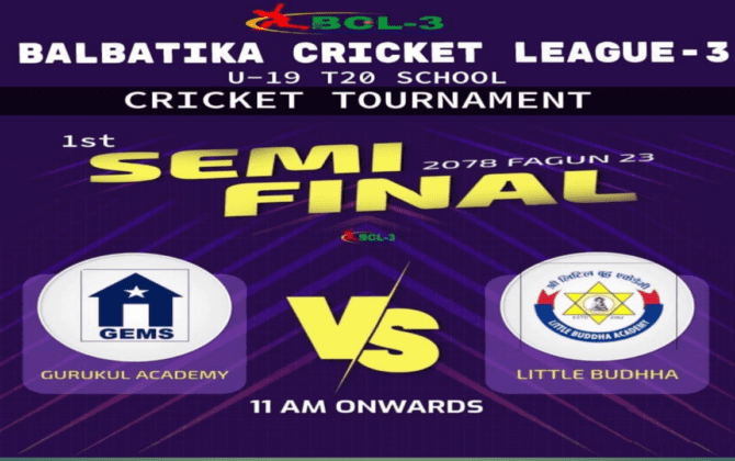 पुरा पढ्नुहोसबौनियाँ, कैलाली-बर्दगोरियामा जारी बालबाटिका क्रिकेट लिग यु-१९ विद्यालय स्तरीय टि-ट्वान्टी प्रतियोगिताको सेमिफाइनल समीकरण पूरा भएको छ । समूह (ए)बाट आयोजक बालबाटिका बिद्या मन्दिर र समूह उप बिजेता बन्दै लिटिल बुद्ध महेन्द्रनगर सेमिफाइनल पुगेको हो
