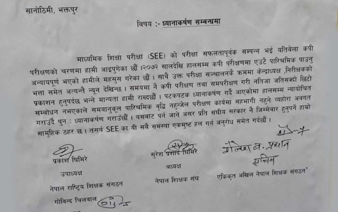 पुरा पढ्नुहोसकाठमाडौँ । शिक्षकहरूले पारिश्रमिक नबढाएसम्म एसईईको उत्तरपुस्तिका नजाच्ने चेतावनी दिएका छन् ।शिक्षकहरूले २०७२ सालदेखि उत्तरपुस्तिका परीक्षणमा हालसम्म एउटै पारिश्रमिक पाउनु अन्यायपूर्ण भएको भन्दै पारिश्रमिक नबढाएसम्म उत्तरपुस्तिका नजाच्ने विज्ञप्तमार्पत जनाएका छन् । नेपाल राष्ट्रिय शिक्षक संगठनका
