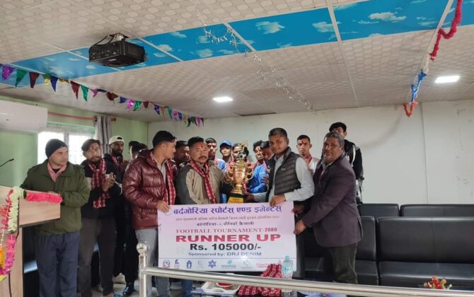 कैलाली । प्रथम मुख्यमन्त्रि पालिका स्तरीय कैलाली जिल्ला व्यापी फुटबल प्रतियोगिता २०८० को उपविजेता बनेका घोडाघोडीका खेलाडीहरुलाई नगरपालिकाले सम्मान तथा धन्यवाद ज्ञापन गरेको छ । शुक्रबार एक कार्यक्रमको आयोजना गरि घोडाघोडी नगरपालिकाले खेलाडीहरुलाई सम्मान