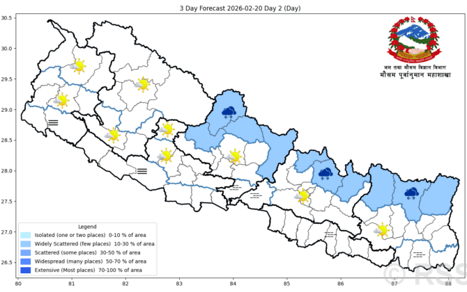 पुरा पढ्नुहोसकाठमाडौँ, हाल देशमा पश्चिमी न्यून चापीय प्रणालीको प्रभाव रहेको मौसम पूर्वानुमान महाशाखाले जनाएको छ । साथै तराईका केही स्थानमा हुस्सु लागेको छ ।कोशी, बागमती र गण्डकी प्रदेशका हिमाली भागमा साधारणतया बादल लाग्नेछ भने मधेस