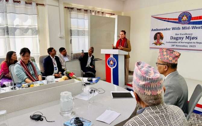 पुरा पढ्नुहोसकर्णाली, नेपालका लागि नर्वेका राजदूत डाग्नी म्योसले उच्च शिक्षा विकासमा नेपाल–नर्वेको सहकार्य निरन्तर हुने बताउनुभएको छ । मध्यपश्चिम विश्वविद्यालयद्वारा बिहीबार सुर्खेत वीरेन्द्रनगरमा आयोजित ‘खुला संसद् र नागरिक सहभागितासम्बन्धी अन्तरसंवाद’ कार्यक्रममा राजदूत म्योसले दुई देशबीच