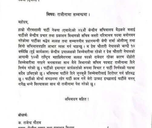 पुरा पढ्नुहोसचौतारीको अध्यक्षमा लडने भन्दै गणेश पाण्डेले दिए पार्टी जिम्मेवारीवाट राजिनामा
